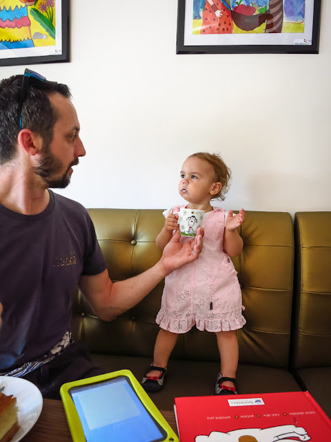 Back in Stara Tura we went to a cafe for the free wifi so that Uncle Richie and Auntie Jeanna could take care of some stuff. The girls got to have some babycinos which they hadn't had for quite some time. They enjoyed it, especially since they had fun cups and biscuits to dip in them.