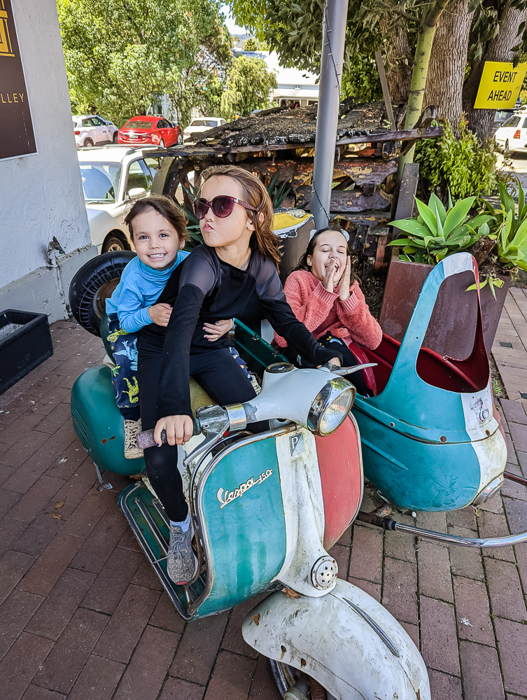 TV took the kids out to lunch while KT got a facial and massage. There were lots of things to see including this Vespa with a sidecar which proved to be popular. Lunch was pretty good, and we enjoyed sitting in the sun.