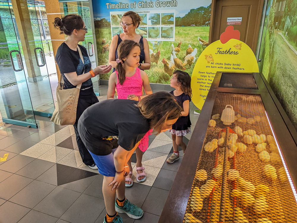 After a quick snack and hydration break we moved on to the second part of the bird park. Staying hydrated was really important since it was so humid as evidenced by the sweat marks (not getting splashed). We didn't let the humidity stop us though as we fed the fish and looked at the chicks. Luckily the gift shop was air conditioned though.